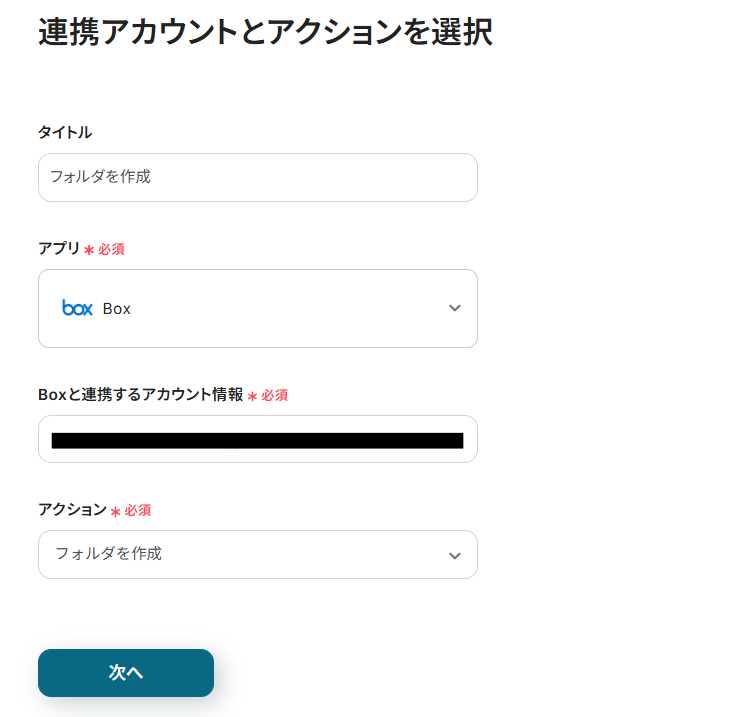 連携アカウントとアクションを選択する画面が表示されるので、今回連携するBoxのアカウントを確認し「次へ」をクリックします。
