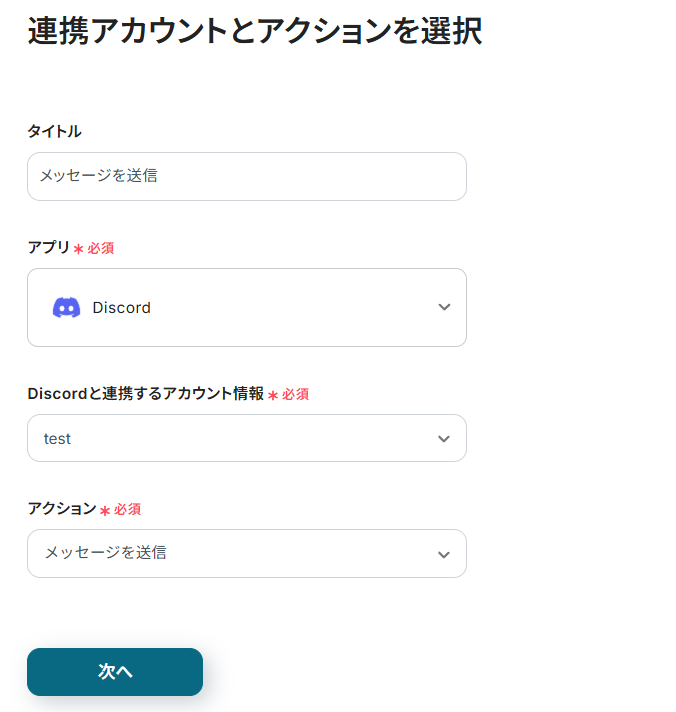 連携アカウントとアクションを選択する画面が表示されるので、今回連携するDiscordのアカウントを確認し「次へ」をクリックします。