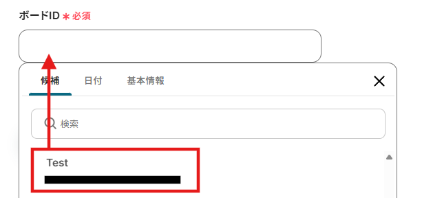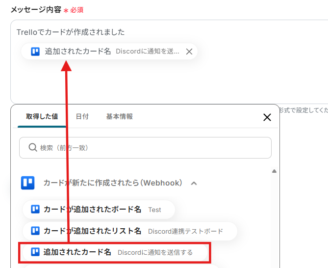 今回は、以下のように取得した値からTrelloの「追加されたカード名」を選択し、作成されたカードが分かりやすいよう設定しました。