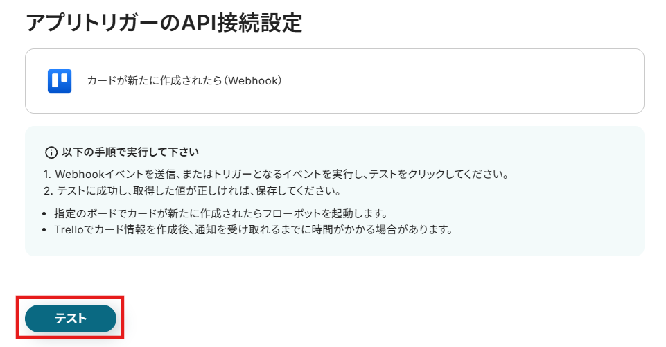 アプリトリガーのAPI接続設定の画面が表示されるので、Trelloでカードを作成してから、「テスト」をクリックしましょう。