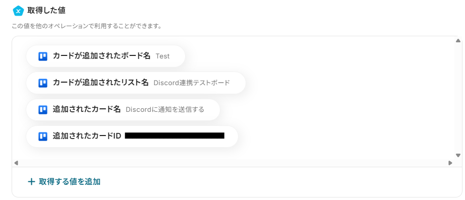 テストが成功したら、以下のように「取得した値」にTrelloで作成したカードの情報が表示されるかを確認します。