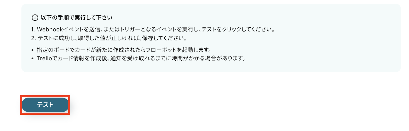 WebhookURLを登録するので、1回目の「テスト」ボタンを押しましょう!