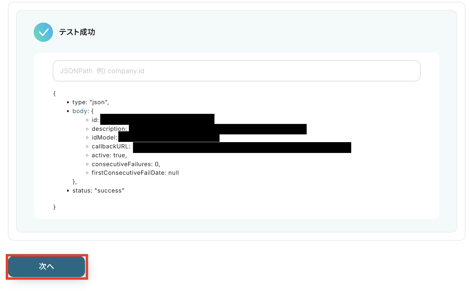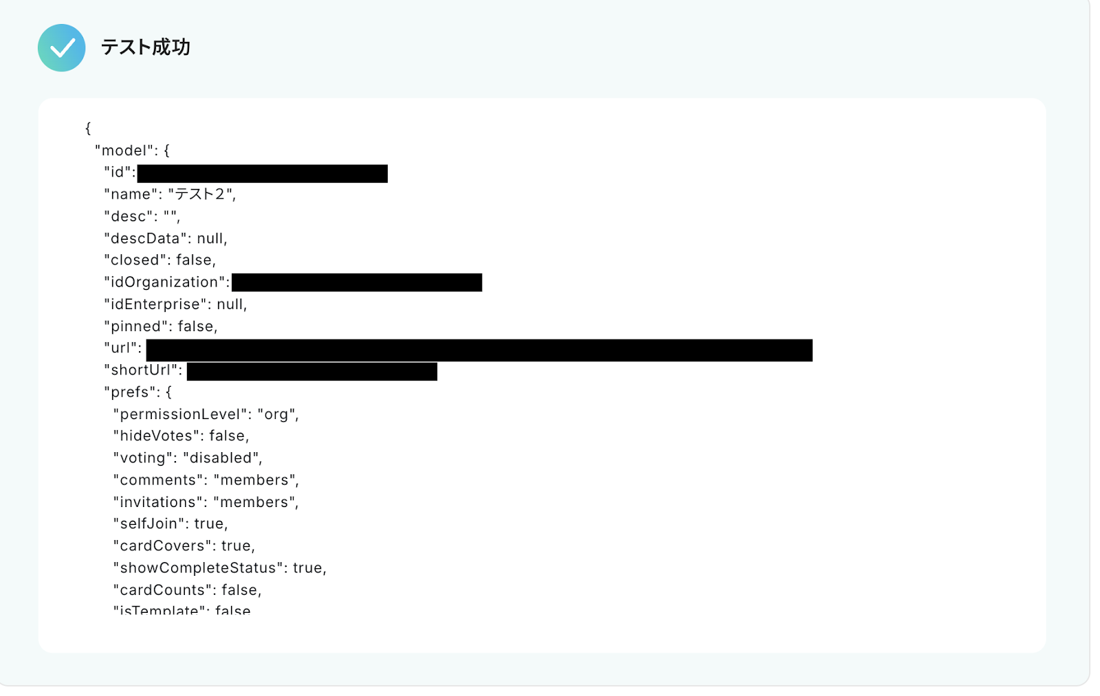 「テスト成功」と表示が出たら、アウトプット(取得した値)が取得されます。