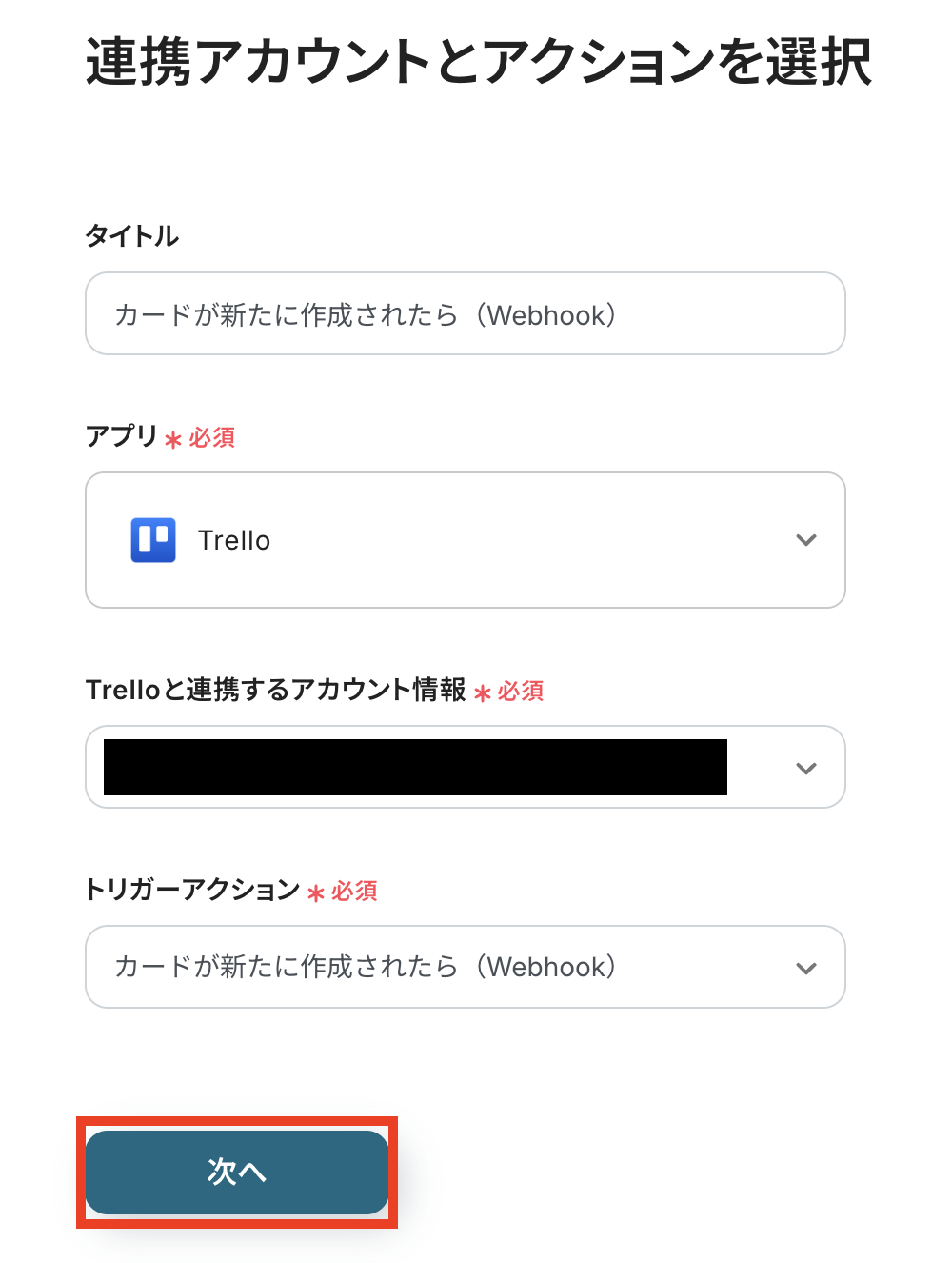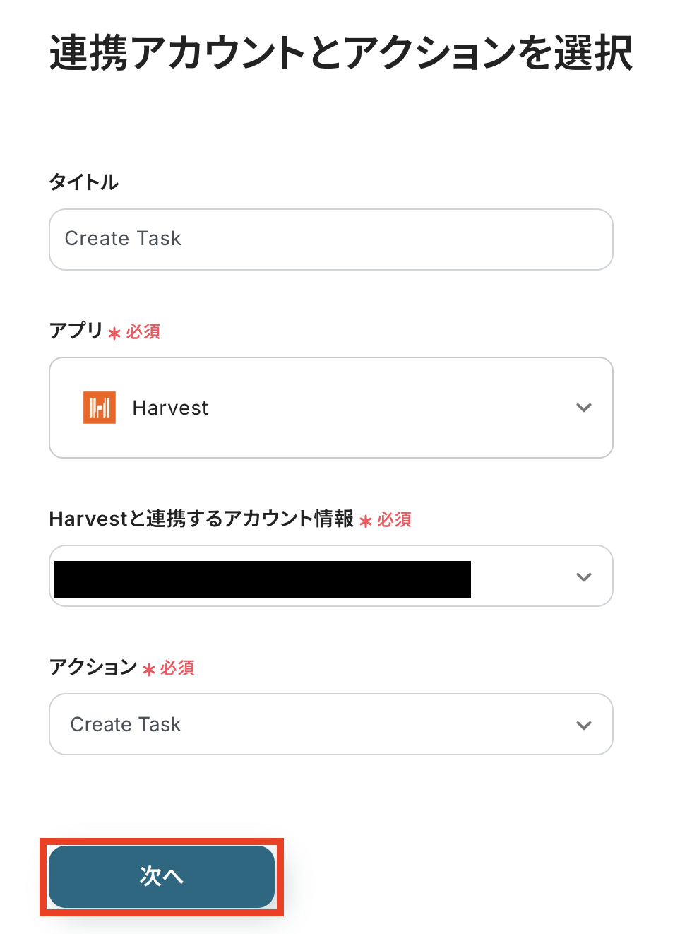 タイトルと連携するアカウント情報を設定し、アクションはテンプレート通りのまま「次へ」をクリックして進んでください。