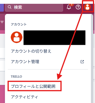 ※Trello画面を開き、右上の人型アイコンを押し、「プロフィールと公開範囲」をクリックするとユーザー名が表示されますよ!
