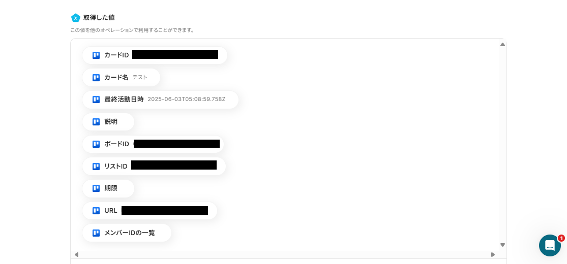 テスト成功後、先ほどTrelloに登録したタスクの情報が取得した値(アウトプット)に表示されます。