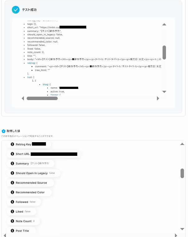 「テスト成功」の文字とリクエスト内容がJSON Pathで表記され、共に「取得した値」として、Tumblrに投稿した内容が反映されていれば成功です!