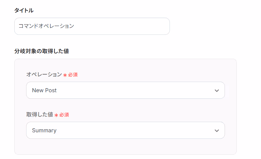 まずはアクションタイトルを任意で設定し、「分岐対象の取得した値」を設定していきましょう。