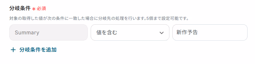 この例では、アプリトリガーで検知したTumblrの投稿内容の中から「Summary」を分岐の対象と設定してみます。