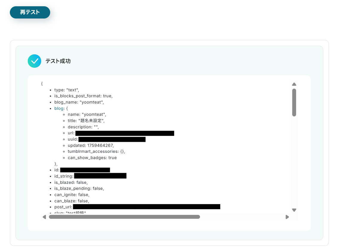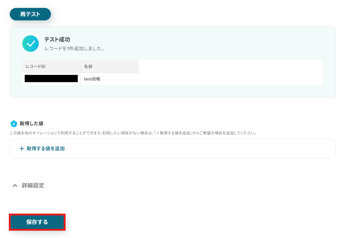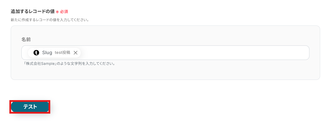 設定が完了したらテストボタンをクリックしましょう。(※実際にNotionにレコードが追加されます。)