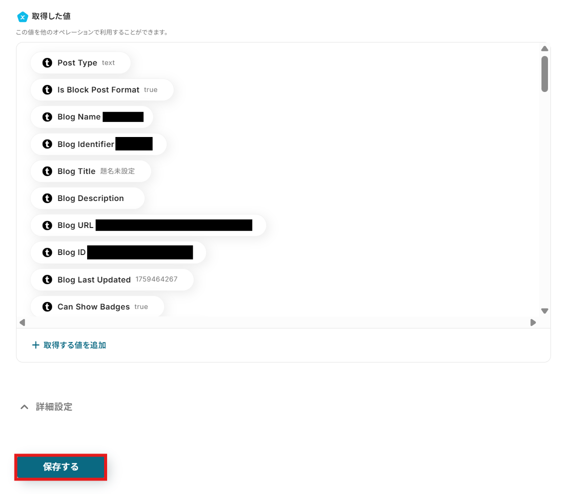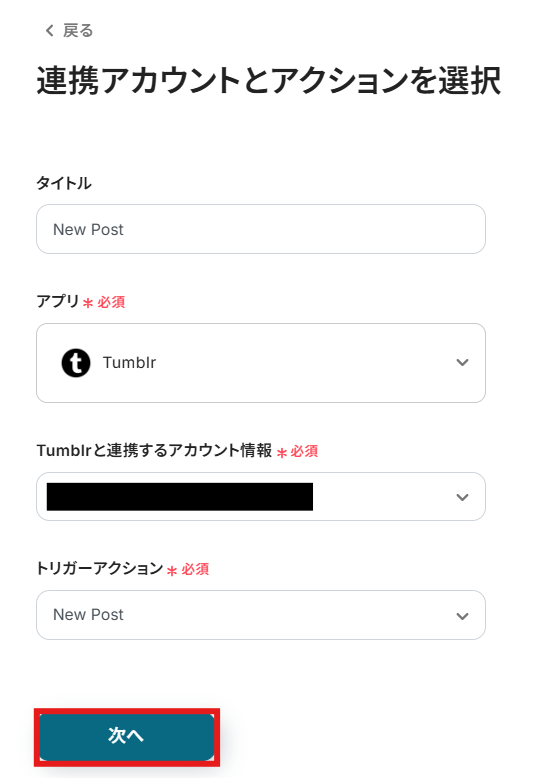 - Tumblrと連携するアカウント情報:フローと紐づけるアカウントを選択してください。