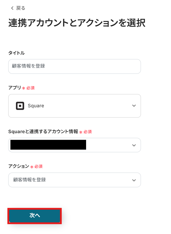- Squareと連携するアカウント情報:フローと紐づけるアカウントを選択してください。