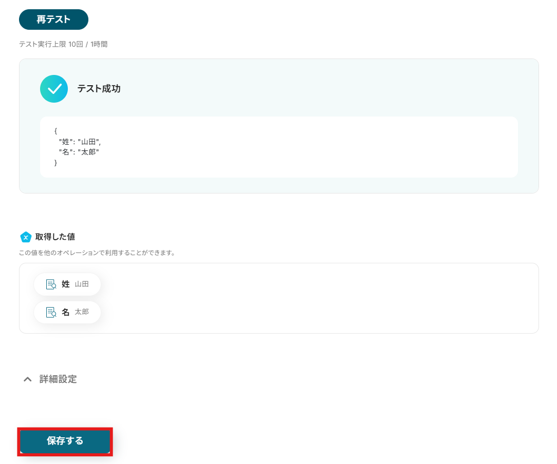 テスト成功が表示されていれば設定完了となります。画面下の保存するボタンをクリックしましょう。