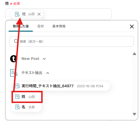 - 姓:プルダウンに表示される取得した値より、姓を選択しましょう。
