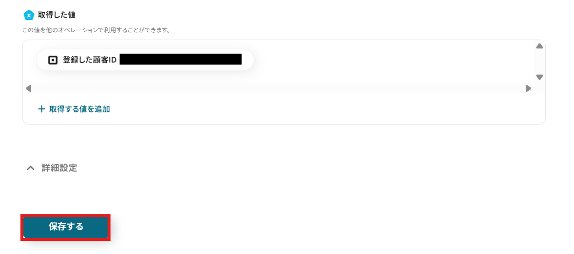 - アクション:プルダウンより設定可能です。今回はデフォルトで設定されている項目(顧客情報を登録)のまま進みましょう。