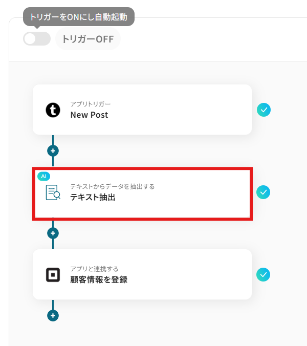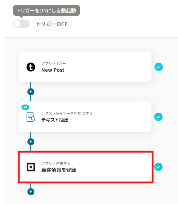 このワークフローを活用すれば、Tumblrに新しい投稿があった際に、AIが自動でテキスト情報を抽出し、その内容をもとにSquareへ顧客情報を登録する一連の流れを自動化できます。TumblrとSquareを連携させることで、こうした定型業務の負担を軽減し、より重要な業務に集中できる環境を整えます。