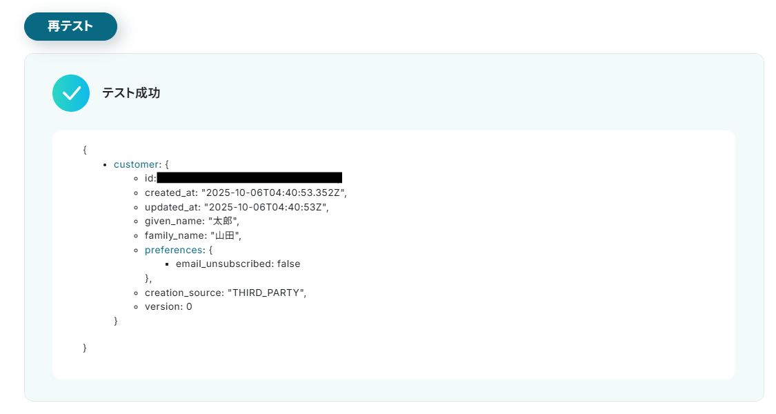 その他の項目は任意で設定を行ってください。設定が完了したらテストボタンをクリックしましょう。(※実際にSquareに顧客情報が作成されます。)
