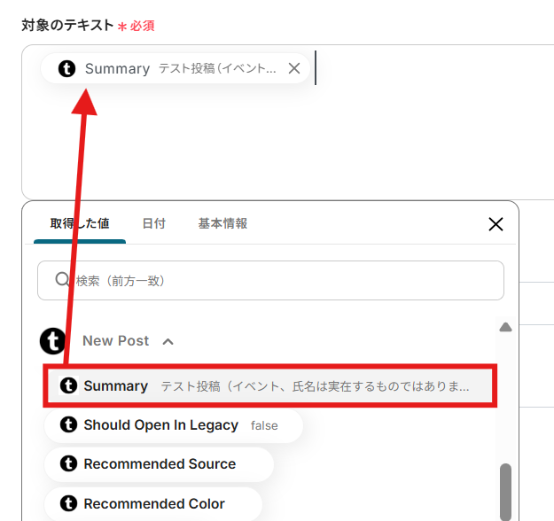 - 対象のテキスト:プルダウンに表示される取得した値より、Summaryを選択しましょう。