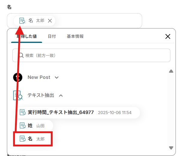 - 名:プルダウンに表示される取得した値より、名を選択しましょう。