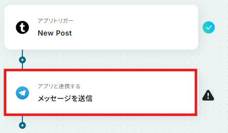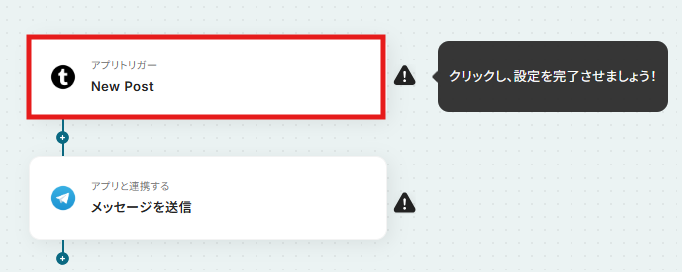 はじめに、TumblrとTelegramをYoomと連携します 次に、トリガーでTumblrを選択し、「New Post」というアクションを設定します 最後に、オペレーションでTelegramの「メッセージを送信」アクションを設定し、Tumblrの投稿内容が自動で通知されるようにします ※「トリガー」:フロー起動のきっかけとなるアクション、「オペレーション」:トリガー起動後、フロー内で処理を行うアクション ■このワークフローのカスタムポイント