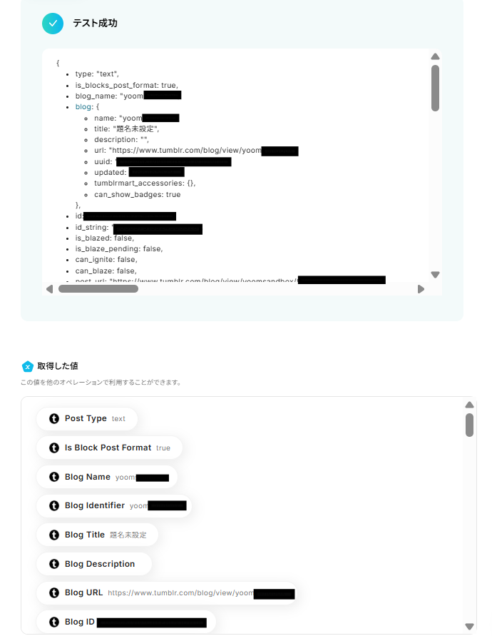 Tumblrのトリガー設定で、通知の対象としたいブログの「Blog Identifier」を任意で設定してください Slackのオペレーション設定では、メッセージを投稿したいチャンネルのIDを任意で設定し、メッセージ内容もTumblrから取得した投稿タイトルやURLなどを組み合わせて自由に作成してください ■注意事項