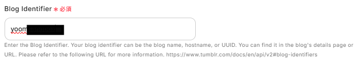 Blog Identifierを入力してください。 ここではBlog nameを入力しました。ブログURLの「https://www.tumblr.com/○○○」の「○○○」の部分です。