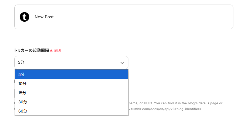 Tumblr、SlackのそれぞれとYoomを連携してください。 トリガーは5分、10分、15分、30分、60分の間隔で起動間隔を選択できます。 プランによって最短の起動間隔が異なりますので、ご注意ください。