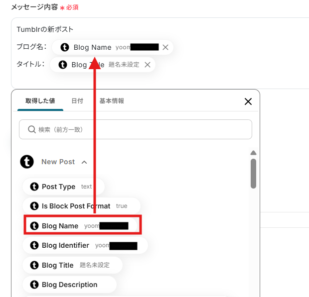 メッセージ内容は取得した値を引用して入力してください。 今回は新ポストの通知なので、ブログ名とタイトルを取得した値から設定しました。 取得した値を活用することで、固定値ではなく、トリガーが実行されるたびに最新の情報が反映できます。