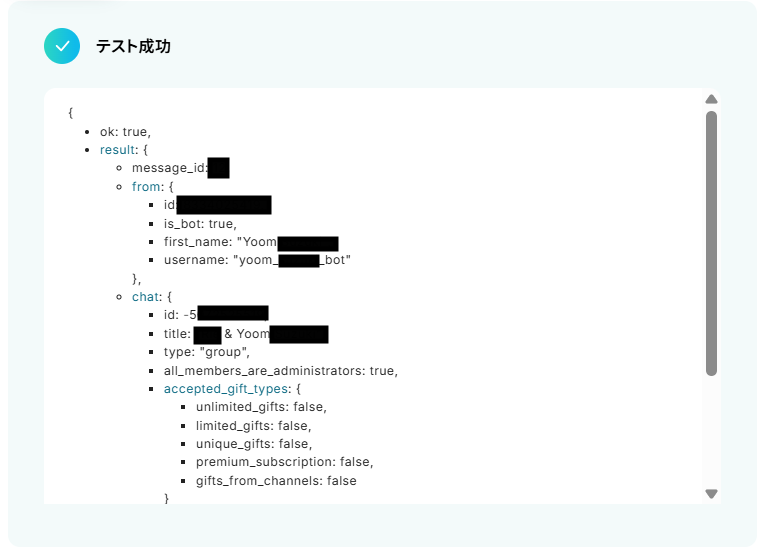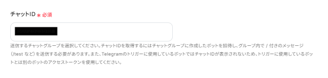 チャットIDを候補から選択します。 脚注を参考にチャットIDを確認してください。 「-100XXXXXXXXX 」のようにマイナス(-)から始まる数字がそのチャットグループのIDとなります。 なお、Telegramのトリガーに使用しているボットではチャットIDが表示されないため、トリガーに使用しているボットとは別のボットのアクセストークンを使用してください。 候補が表示されない場合、該当のボットが招待されているグループ内で / 付きのメッセージ(/test など)を送信すると表示されます。