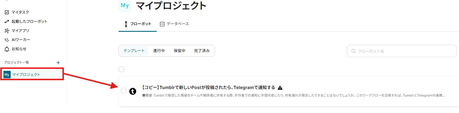 コピーしたテンプレートはマイプロジェクトに保存されています。 修正したい場合などあとでフローを確認したい場合は、マイプロジェクトからも開くことができます。