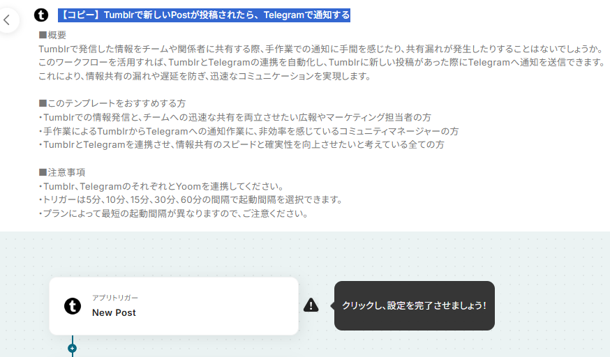 Tumblrでの情報発信と、チームへの迅速な共有を両立させたい広報やマーケティング担当者の方 手作業によるTumblrからTelegramへの通知作業に、非効率を感じているコミュニティマネージャーの方 TumblrとTelegramを連携させ、情報共有のスピードと確実性を向上させたいと考えている全ての方 ■このテンプレートを使うメリット
