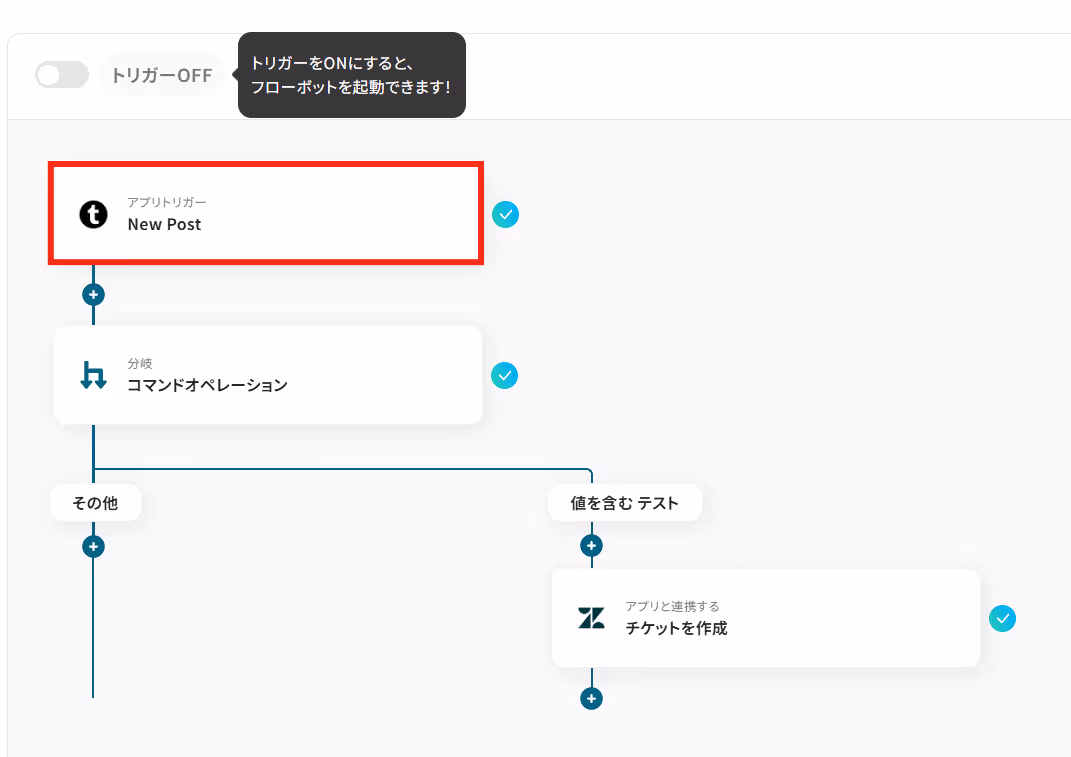このフローには特定条件で処理を分岐させる設定が含まれており、<span class="mark-yellow">例えば「よくある質問」タグが付いたチケットが作成された場合のみ、その内容をFAQとしてTumblrに投稿するといった運用が可能になり、情報発信業務を大幅に効率化します。</span>