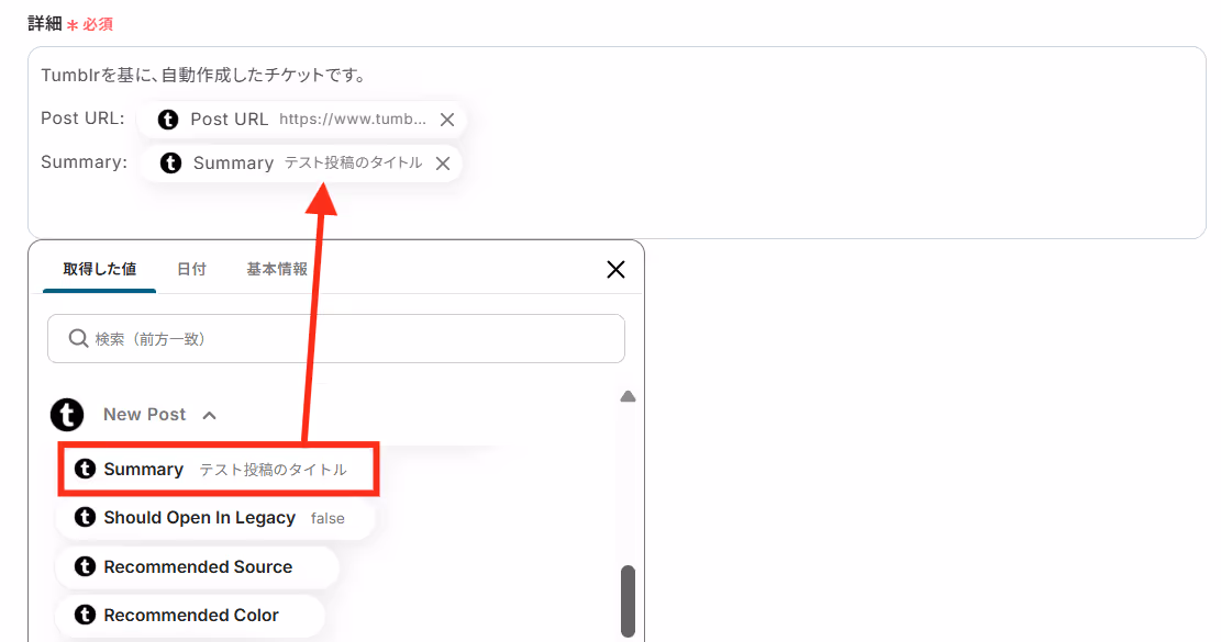 今回はTumblrの投稿内容に「テスト」の文字列が含まれている場合の条件を設定していきます。