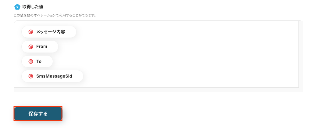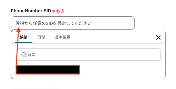 入力欄をクリックすると、前のステップでTwilioから取得済みのアウトプットが表示されるので、選択して入力しましょう。