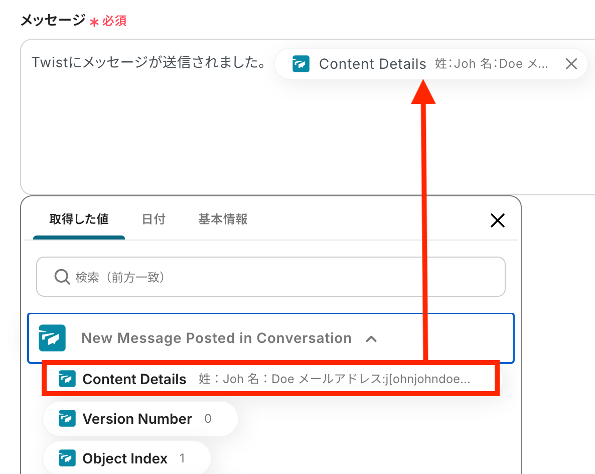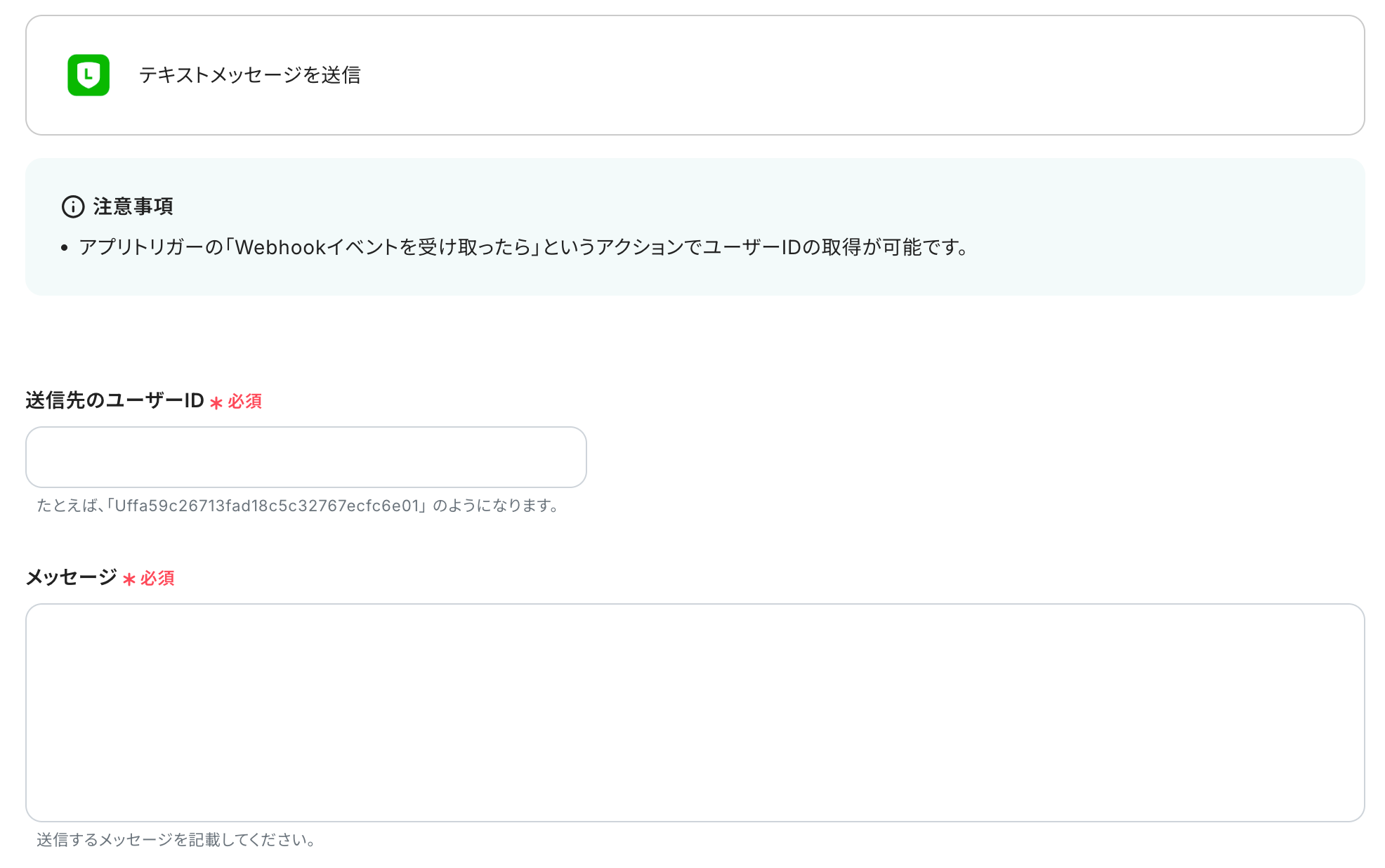 メッセージ内容を設定しましょう。任意の内容を手入力による固定値で設定する他、取得した値を組み合わせた文面を作成することも可能です。