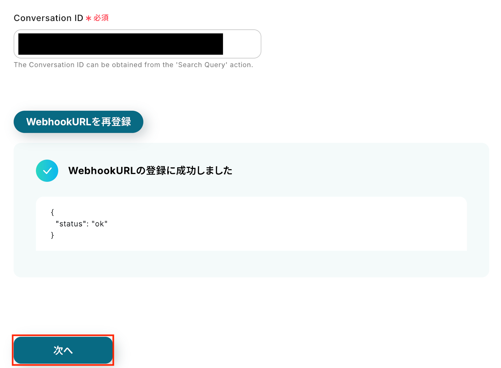 「WebhookURLを登録」を実行し、成功したことを確認して「次へ」を押します。