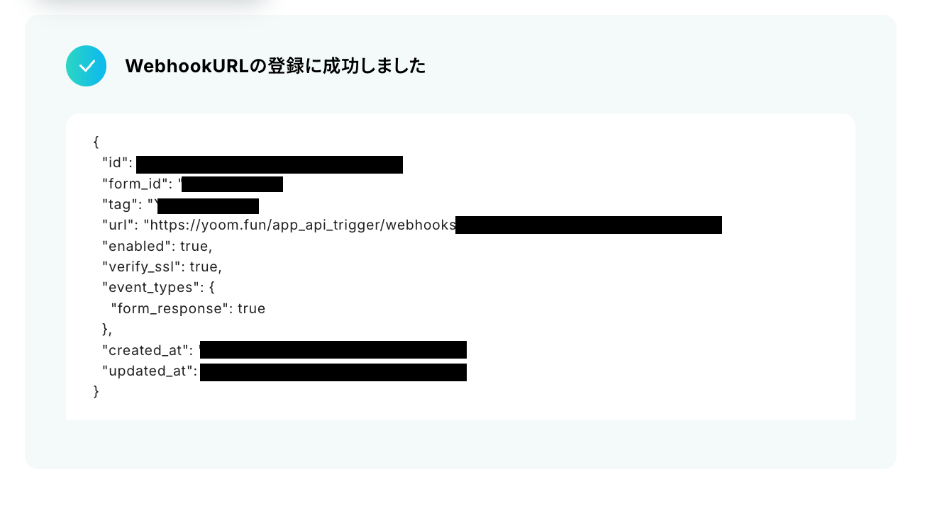 Typeformにフォームを作成したら、Yoomの操作画面に戻りましょう。 フォームIDとタグを手動で設定して、「Webhook URLを登録」ボタンを押します。