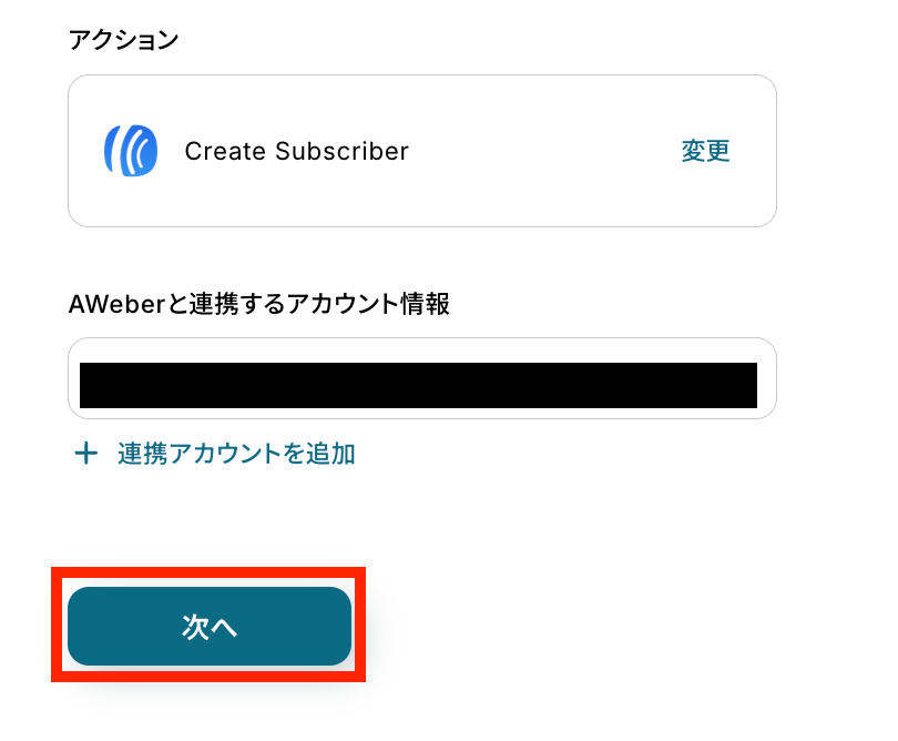 ステップ4:AWeberのアクション設定 取得した値を用いて、AWeber上にSubscriber(購読者)を作成する設定を行います。 次の赤枠をクリックしましょう。
