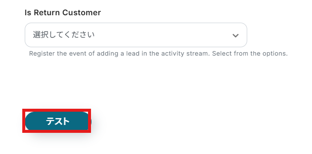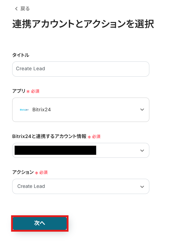 - アクション:プルダウンより設定可能です。今回はデフォルトで設定されている項目(Create Lead)のまま進みましょう。
