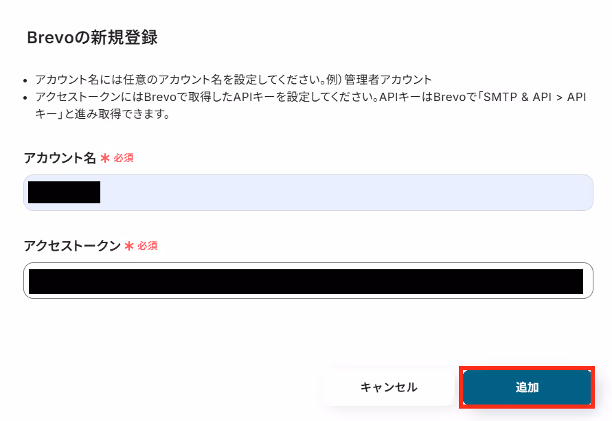 Brevoよりアクセストークン(APIキー)を取得し、入力してください。