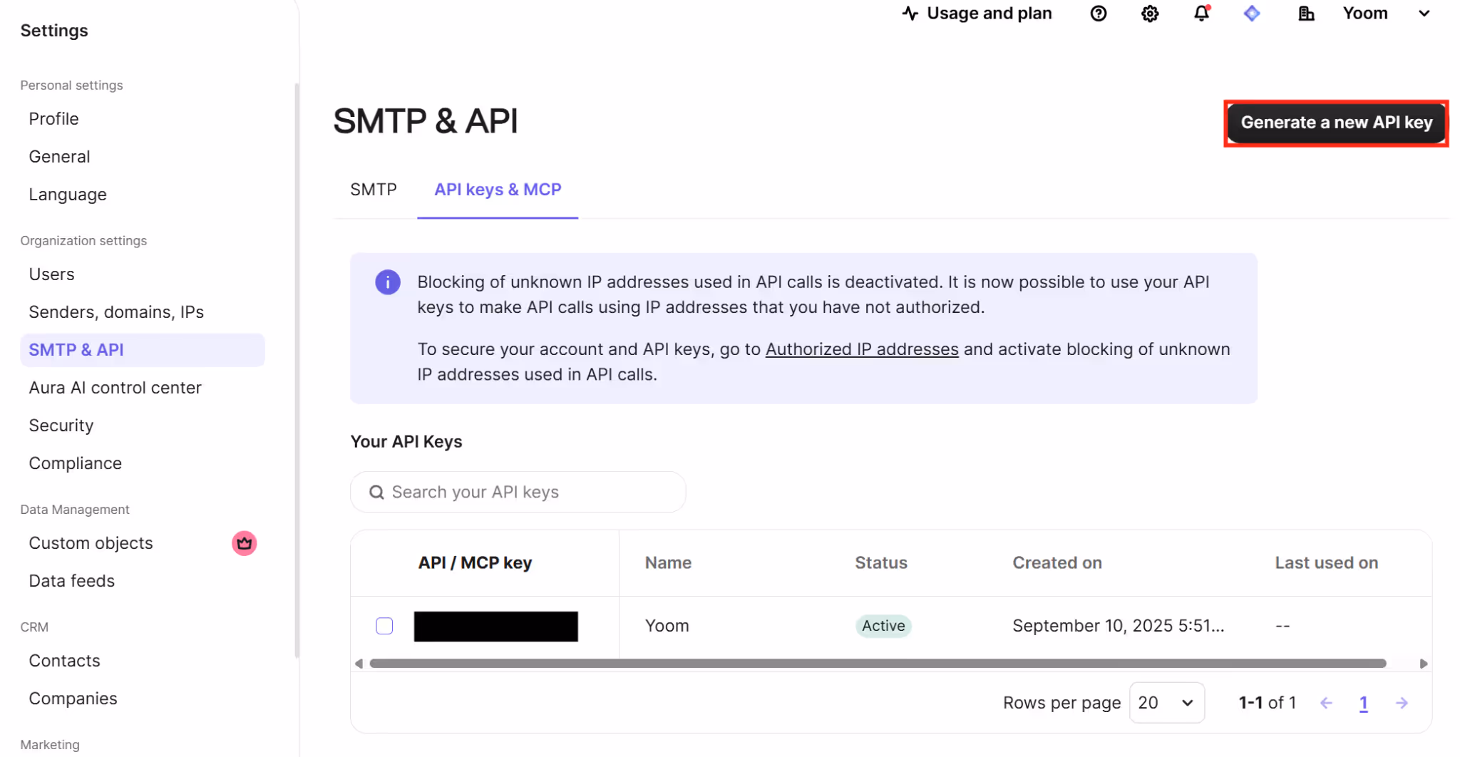 ※アクセストークン(APIキー)はBrevoの下記画面から作成・取得が可能です。