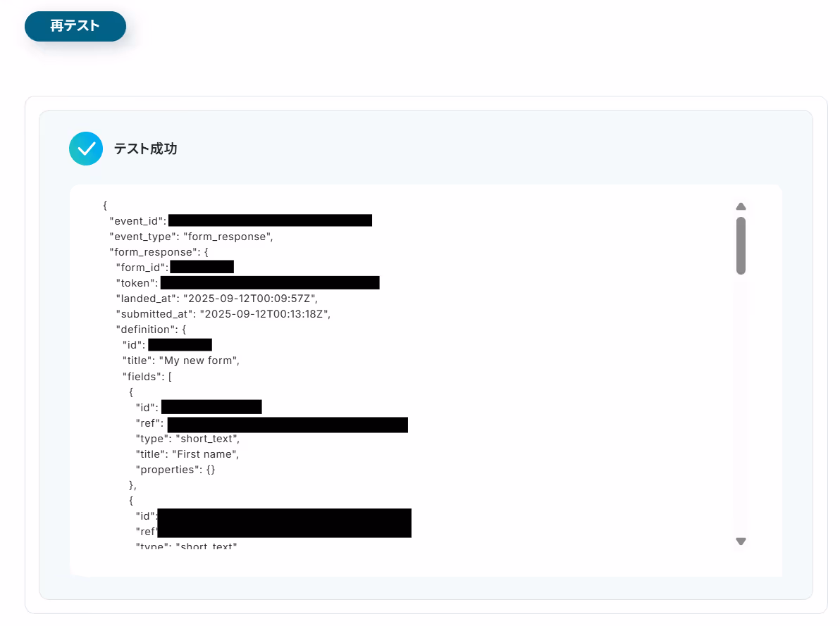 次の画面のテストでフォームの回答結果を取得するため、先ほど作成したフォームに回答を送信してください。