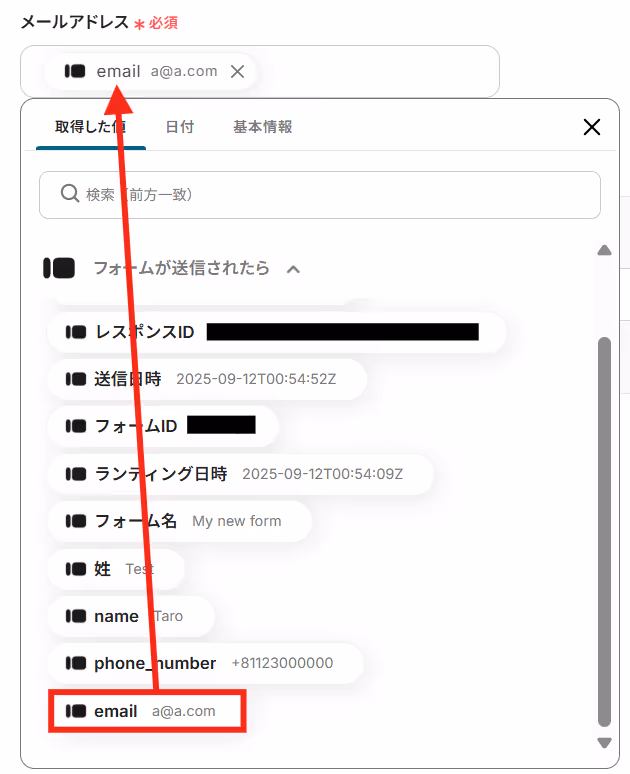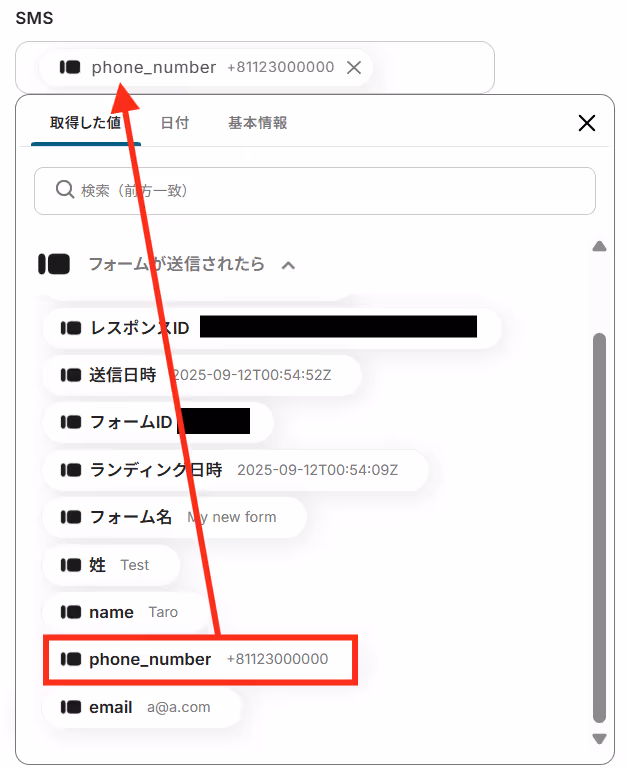 取得した値を中身を確認し、登録したい内容が取得できているかを確認してください。