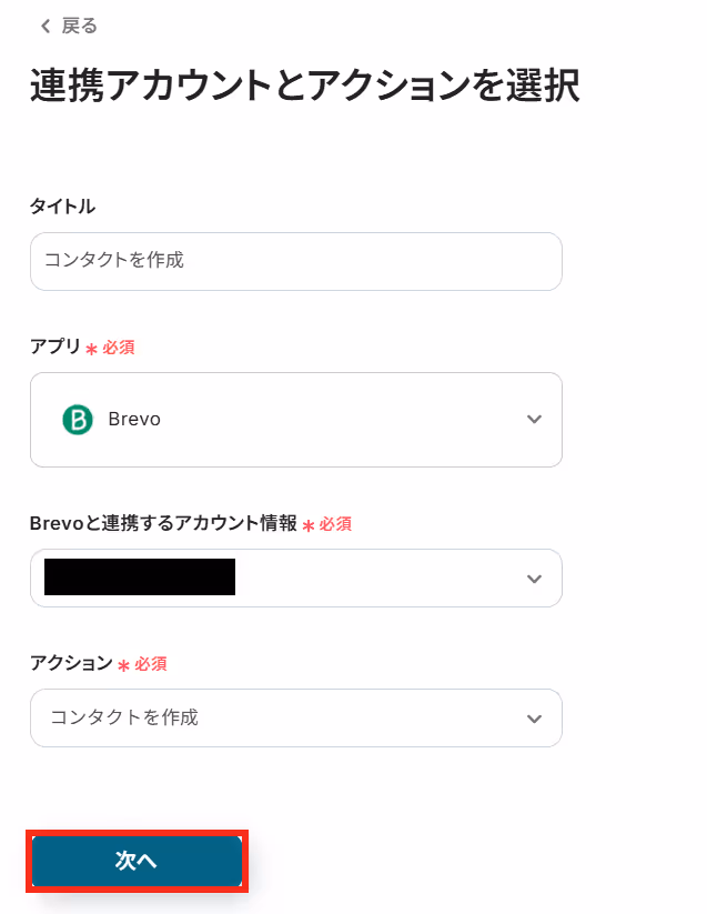 「連携アカウントとアクションを選択」画面では以下を設定します。