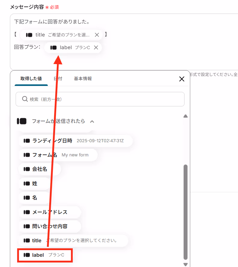 取得した情報より、回答した選択肢を取得するために「取得する値を追加」をクリックしてください。