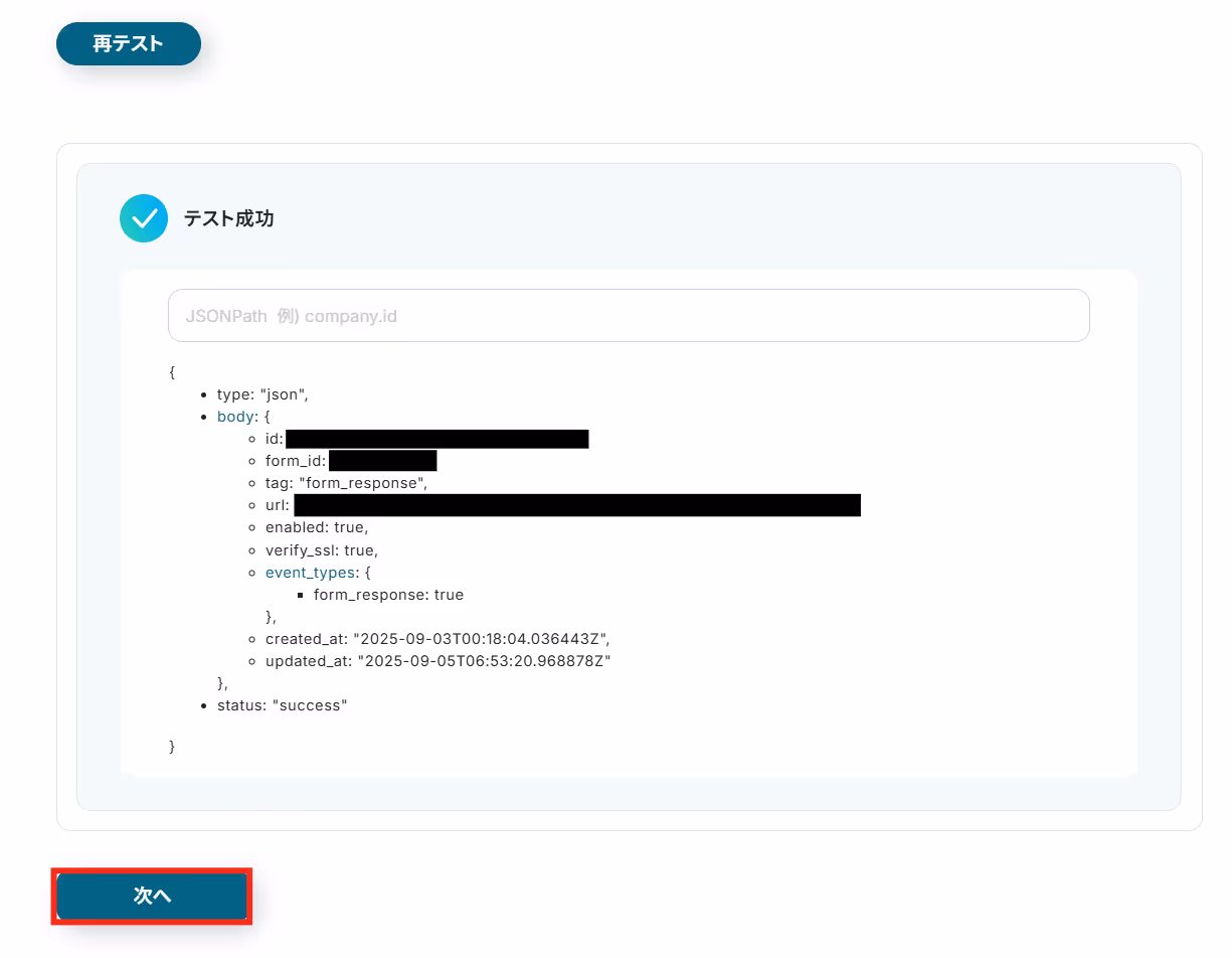 テスト成功が表示されたら、回答の取得完了となります。