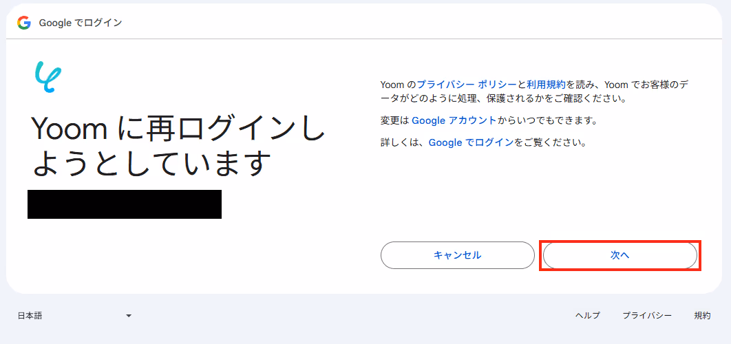 選択したGoogleアカウントでログイン確認画面が表示されるので、「次へ」をクリックします。