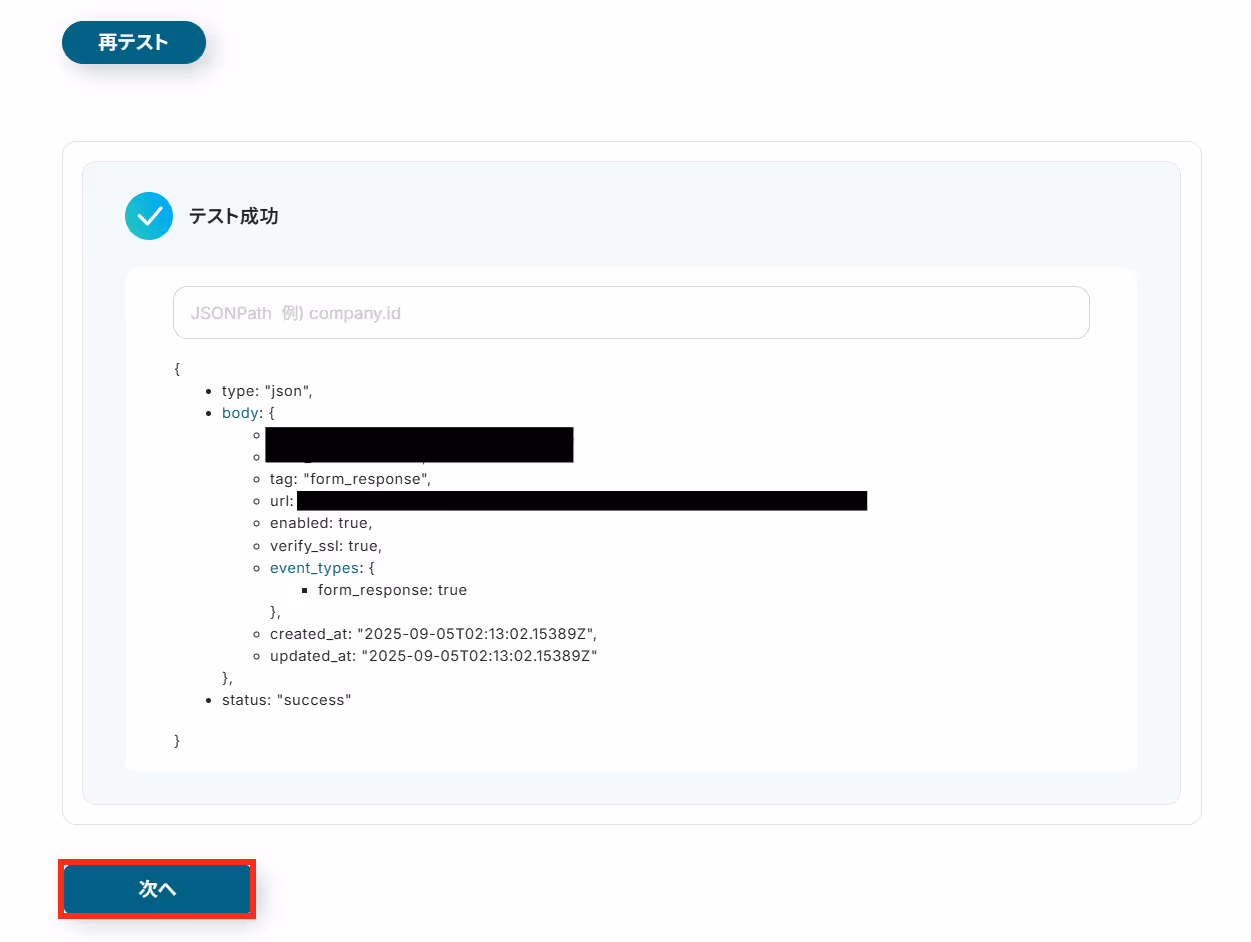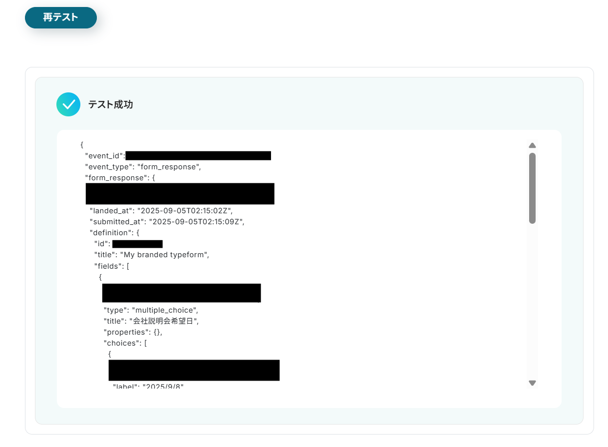 テスト成功が表示されたら、回答の取得完了となります。