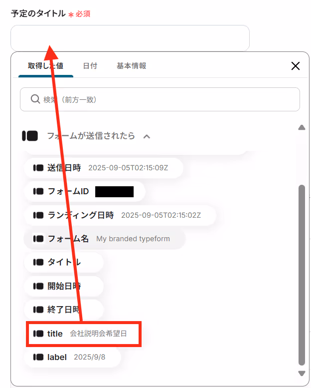 下記ウィンドウが表示されたら、fieldsの中のtitleの+ボタンをクリックしてください。この項目はGoogleカレンダーに追加する予定のタイトルに設定します。