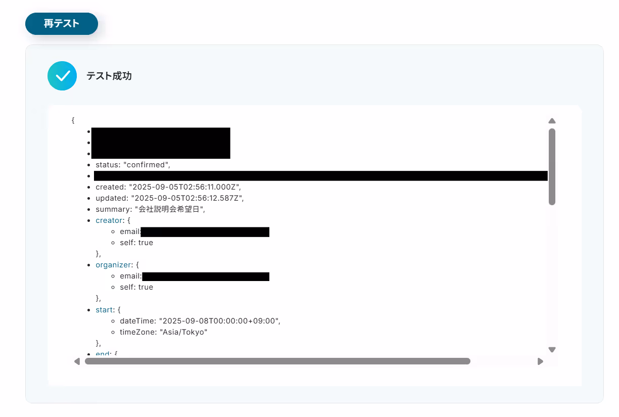 設定が完了したらテストボタンをクリックしましょう。(※実際にGoogleカレンダーに予定が登録されます。)